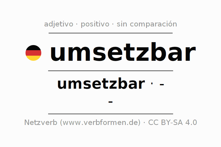 El adjetivo umsetzbar se declina (implementable, realizable) utilizando la construcción umsetzbar, la cual no puede ser exaltada, es decir este adjetivo no permite formas del comparativo o superlativo. El adjetivo umsetzbar puede ser utilizado de forma atributiva en frente de un sustantivo así como de forma predicativa en conjunto con un verbo.Aquí puedes declinar y comparar no solamente umsetzbar sino también todos los adjetivos alemanes. Comentarios ☆