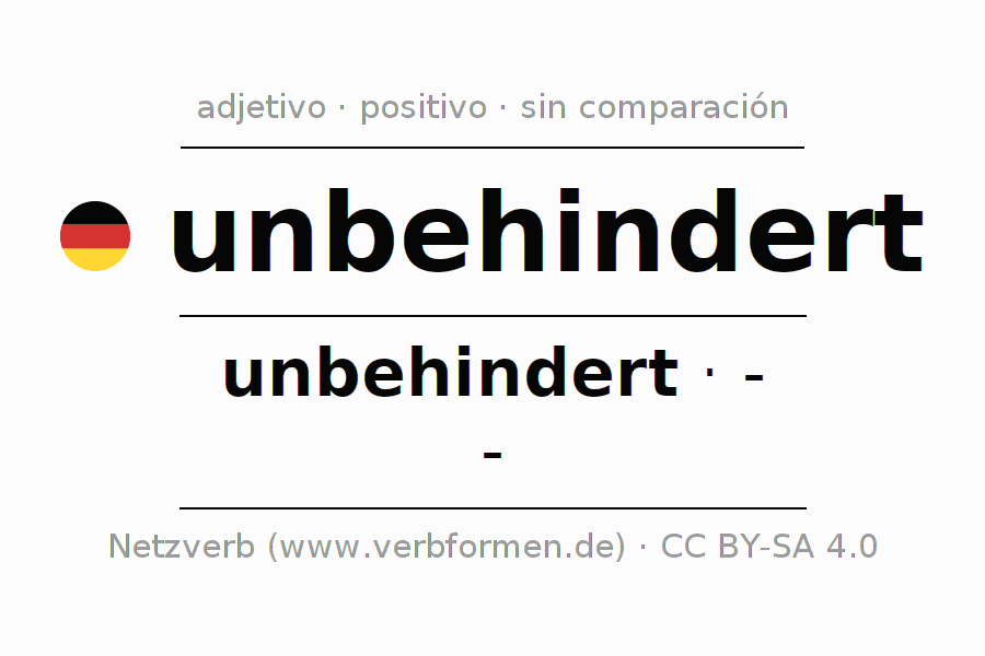 El adjetivo unbehindert se declina (sin obstáculos, sin restricciones) utilizando la construcción unbehindert, la cual no puede ser exaltada, es decir este adjetivo no permite formas del comparativo o superlativo. El adjetivo unbehindert puede ser utilizado de forma atributiva en frente de un sustantivo así como de forma predicativa en conjunto con un verbo.Aquí puedes declinar y comparar no solamente unbehindert sino también todos los adjetivos alemanes. Comentarios ☆