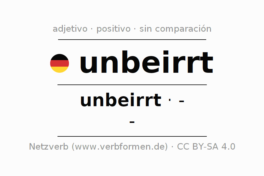 El adjetivo unbeirrt se declina (imperturbable, inquebrantable) utilizando la construcción unbeirrt, la cual no puede ser exaltada, es decir este adjetivo no permite formas del comparativo o superlativo. El adjetivo unbeirrt puede ser utilizado de forma atributiva en frente de un sustantivo así como de forma predicativa en conjunto con un verbo.Aquí puedes declinar y comparar no solamente unbeirrt sino también todos los adjetivos alemanes. Comentarios ☆