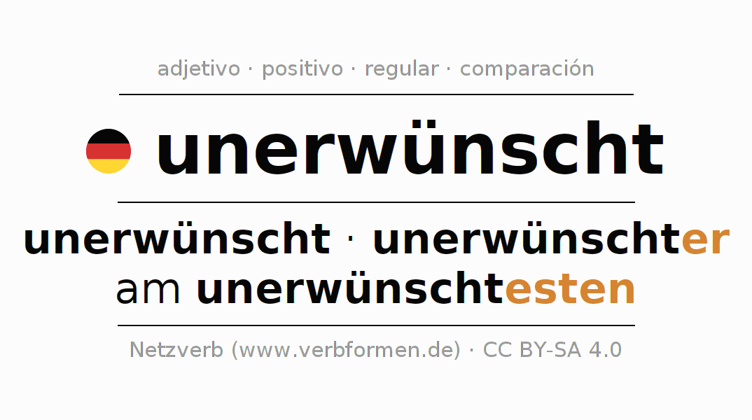 El adjetivo unerwünscht se declina (no deseado, indeseado) utilizando las construcciones de comparación. Las terminaciones necesarias para la exaltación, comparación y el superlativo son er/esten. El adjetivo unerwünscht puede ser utilizado de forma atributiva en frente de un sustantivo así como de forma predicativa en conjunto con un verbo.Aquí puedes declinar y comparar no solamente unerwünscht sino también todos los adjetivos alemanes. Comentarios ☆