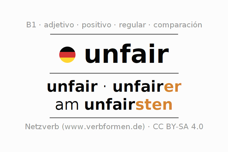 El adjetivo unfair se declina (injusto, desleal) utilizando las construcciones de comparación. Las terminaciones necesarias para la exaltación, comparación y el superlativo son er/sten. El adjetivo unfair puede ser utilizado de forma atributiva en frente de un sustantivo así como de forma predicativa en conjunto con un verbo.Aquí puedes declinar y comparar no solamente unfair sino también todos los adjetivos alemanes. Comentarios ☆