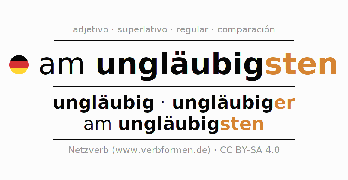 El comparativo en forma de tabla con todas sus formas de declinación: fuerte, débil y mixta. Estas están representadas de forma clara en una tabla sinópica en singular, plural y en los cuatro casos gramaticales: nominativo (primer caso), genitivo (segundo caso), dativo (tercer caso) y acusativo (cuarto caso). Aquí encontraras más información acerca del tema Wiktionary am ungläubigsten y aquí también a través del Duden am ungläubigsten.