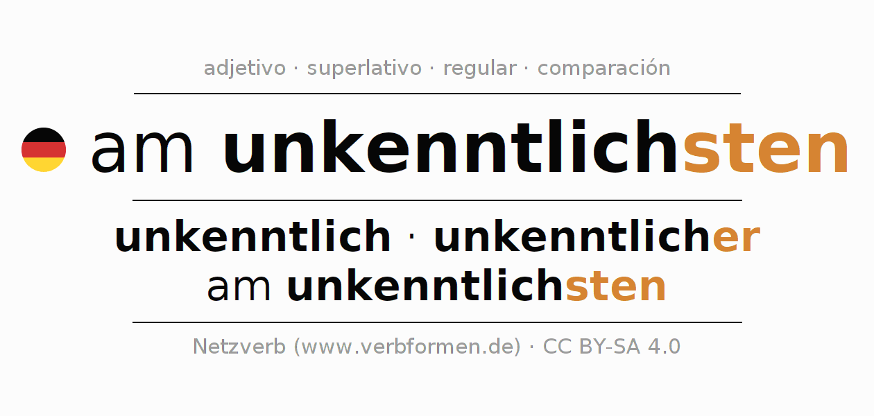 El comparativo en forma de tabla con todas sus formas de declinación: fuerte, débil y mixta. Estas están representadas de forma clara en una tabla sinópica en singular, plural y en los cuatro casos gramaticales: nominativo (primer caso), genitivo (segundo caso), dativo (tercer caso) y acusativo (cuarto caso). Aquí encontraras más información acerca del tema Wiktionary am unkenntlichsten y aquí también a través del Duden am unkenntlichsten.