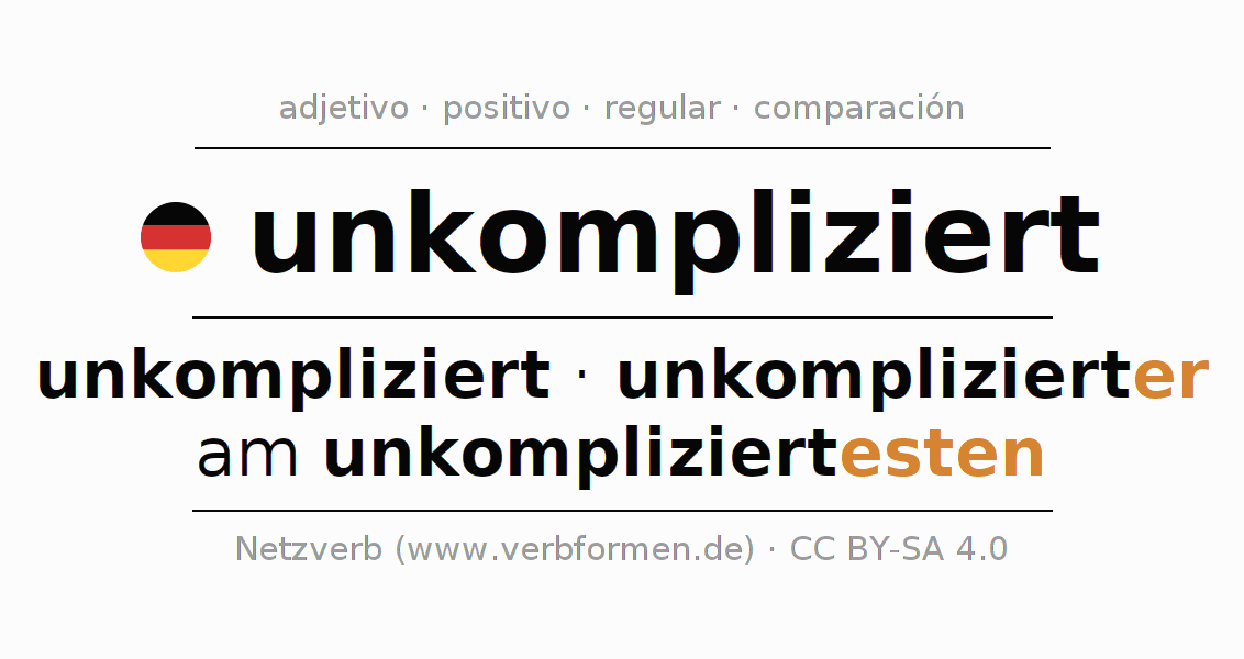 El adjetivo unkompliziert se declina (fácil, sencillo) utilizando las construcciones de comparación. Las terminaciones necesarias para la exaltación, comparación y el superlativo son er/esten. El adjetivo unkompliziert puede ser utilizado de forma atributiva en frente de un sustantivo así como de forma predicativa en conjunto con un verbo.Aquí puedes declinar y comparar no solamente unkompliziert sino también todos los adjetivos alemanes. Comentarios ☆