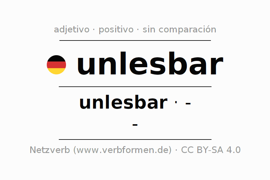 El adjetivo unlesbar se declina (illegible, ininteligible) utilizando la construcción unlesbar, la cual no puede ser exaltada, es decir este adjetivo no permite formas del comparativo o superlativo. El adjetivo unlesbar puede ser utilizado de forma atributiva en frente de un sustantivo así como de forma predicativa en conjunto con un verbo.Aquí puedes declinar y comparar no solamente unlesbar sino también todos los adjetivos alemanes. Comentarios ☆