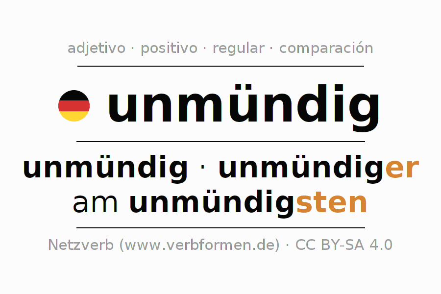 El comparativo en forma de tabla con todas sus formas de declinación: fuerte, débil y mixta. Estas están representadas de forma clara en una tabla sinópica en singular, plural y en los cuatro casos gramaticales: nominativo (primer caso), genitivo (segundo caso), dativo (tercer caso) y acusativo (cuarto caso). Aquí encontraras más información acerca del tema Wiktionary unmündig y aquí también a través del Duden unmündig.