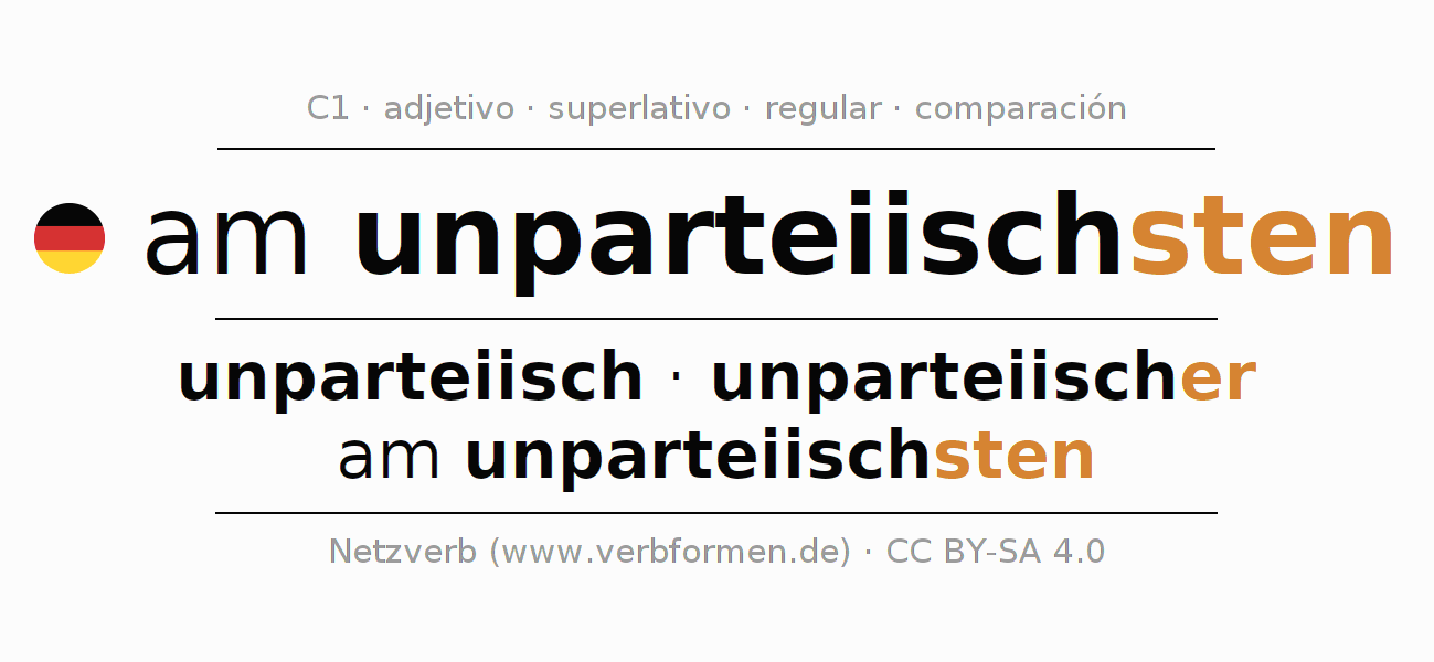 El comparativo en forma de tabla con todas sus formas de declinación: fuerte, débil y mixta. Estas están representadas de forma clara en una tabla sinópica en singular, plural y en los cuatro casos gramaticales: nominativo (primer caso), genitivo (segundo caso), dativo (tercer caso) y acusativo (cuarto caso). Aquí encontraras más información acerca del tema Wiktionary am unparteiischsten y aquí también a través del Duden am unparteiischsten.