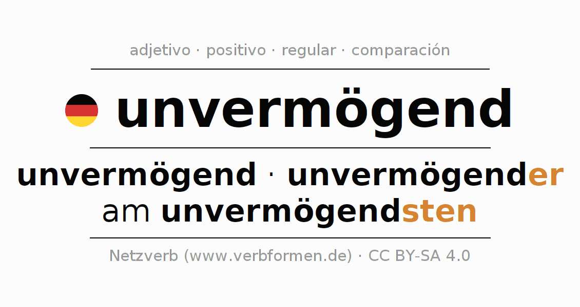 El comparativo en forma de tabla con todas sus formas de declinación: fuerte, débil y mixta. Estas están representadas de forma clara en una tabla sinópica en singular, plural y en los cuatro casos gramaticales: nominativo (primer caso), genitivo (segundo caso), dativo (tercer caso) y acusativo (cuarto caso). Aquí encontraras más información acerca del tema Wiktionary unvermögend y aquí también a través del Duden unvermögend.