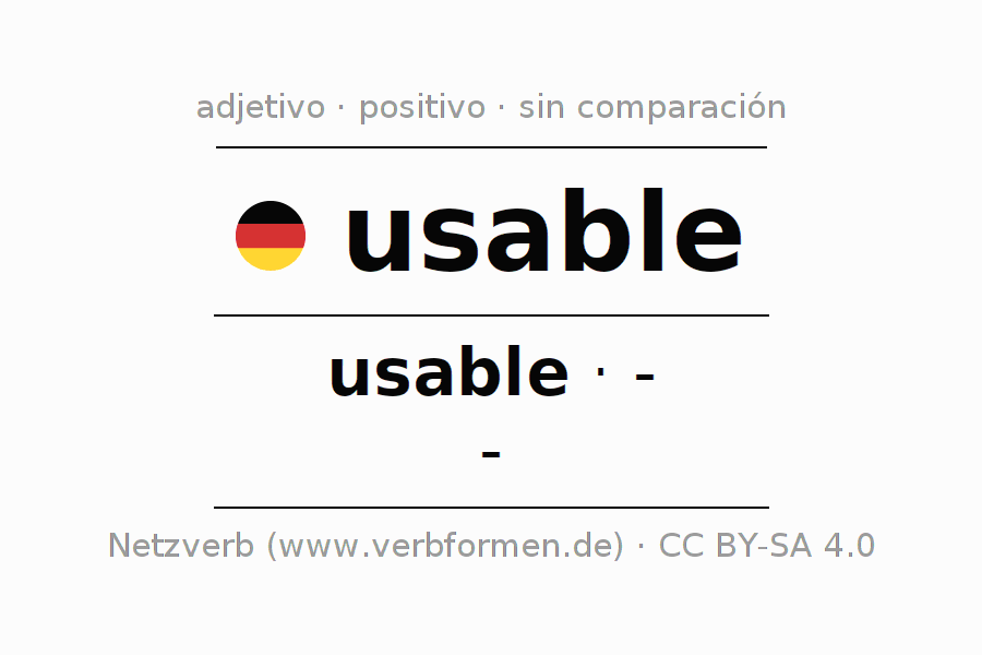 El adjetivo usable se declina utilizando la construcción usable, la cual no puede ser exaltada, es decir este adjetivo no permite formas del comparativo o superlativo. El adjetivo usable puede ser utilizado de forma atributiva en frente de un sustantivo así como de forma predicativa en conjunto con un verbo.Aquí puedes declinar y comparar no solamente usable sino también todos los adjetivos alemanes. Comentarios ☆