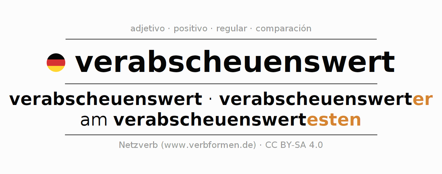 El comparativo en forma de tabla con todas sus formas de declinación: fuerte, débil y mixta. Estas están representadas de forma clara en una tabla sinópica en singular, plural y en los cuatro casos gramaticales: nominativo (primer caso), genitivo (segundo caso), dativo (tercer caso) y acusativo (cuarto caso). Aquí encontraras más información acerca del tema Wiktionary verabscheuenswert y aquí también a través del Duden verabscheuenswert.