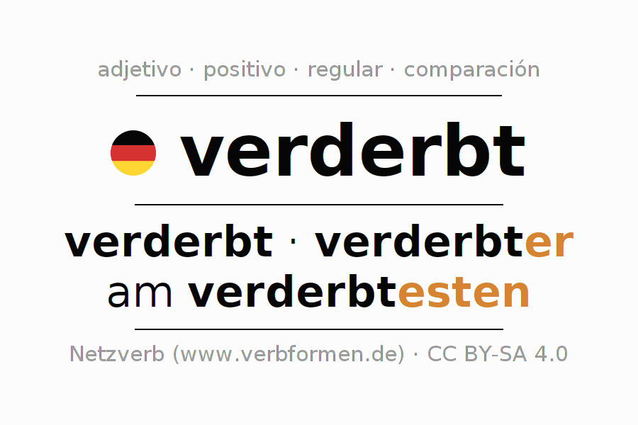 El comparativo en forma de tabla con todas sus formas de declinación: fuerte, débil y mixta. Estas están representadas de forma clara en una tabla sinópica en singular, plural y en los cuatro casos gramaticales: nominativo (primer caso), genitivo (segundo caso), dativo (tercer caso) y acusativo (cuarto caso). Aquí encontraras más información acerca del tema Wiktionary verderbt y aquí también a través del Duden verderbt.