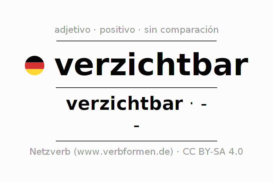 El comparativo en forma de tabla con todas sus formas de declinación: fuerte, débil y mixta. Estas están representadas de forma clara en una tabla sinópica en singular, plural y en los cuatro casos gramaticales: nominativo (primer caso), genitivo (segundo caso), dativo (tercer caso) y acusativo (cuarto caso). Aquí encontraras más información acerca del tema Wiktionary verzichtbar y aquí también a través del Duden verzichtbar.