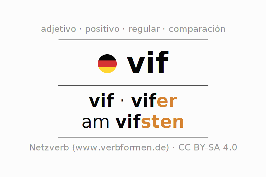 El adjetivo vif se declina (despierto, enérgico) utilizando las construcciones de comparación. Las terminaciones necesarias para la exaltación, comparación y el superlativo son er/sten. El adjetivo vif puede ser utilizado de forma atributiva en frente de un sustantivo así como de forma predicativa en conjunto con un verbo.Aquí puedes declinar y comparar no solamente vif sino también todos los adjetivos alemanes. Comentarios ☆