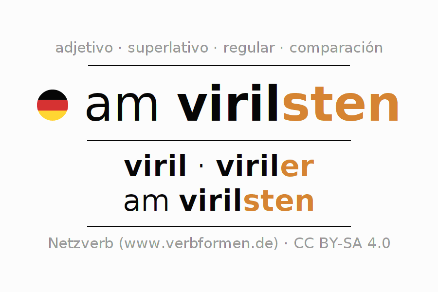 El comparativo en forma de tabla con todas sus formas de declinación: fuerte, débil y mixta. Estas están representadas de forma clara en una tabla sinópica en singular, plural y en los cuatro casos gramaticales: nominativo (primer caso), genitivo (segundo caso), dativo (tercer caso) y acusativo (cuarto caso). Aquí encontraras más información acerca del tema Wiktionary am virilsten y aquí también a través del Duden am virilsten.