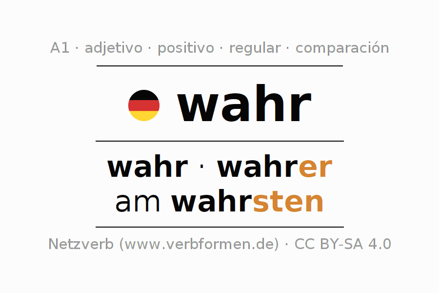 El adjetivo wahr se declina (verdadero, real) utilizando las construcciones de comparación. Las terminaciones necesarias para la exaltación, comparación y el superlativo son er/sten. El adjetivo wahr puede ser utilizado de forma atributiva en frente de un sustantivo así como de forma predicativa en conjunto con un verbo.Aquí puedes declinar y comparar no solamente wahr sino también todos los adjetivos alemanes. Comentarios ☆
