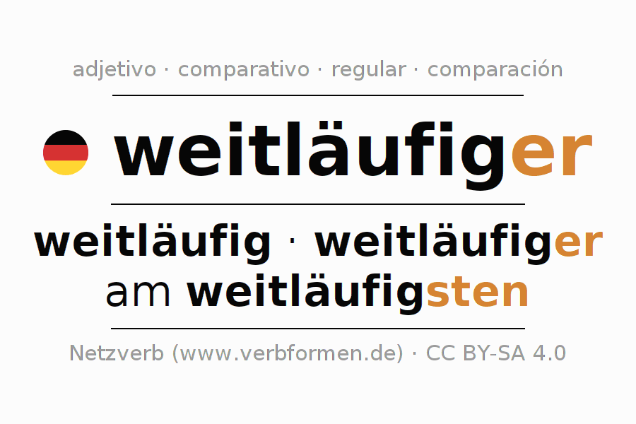 El comparativo en forma de tabla con todas sus formas de declinación: fuerte, débil y mixta. Estas están representadas de forma clara en una tabla sinópica en singular, plural y en los cuatro casos gramaticales: nominativo (primer caso), genitivo (segundo caso), dativo (tercer caso) y acusativo (cuarto caso). Aquí encontraras más información acerca del tema Wiktionary weitläufiger y aquí también a través del Duden weitläufiger.