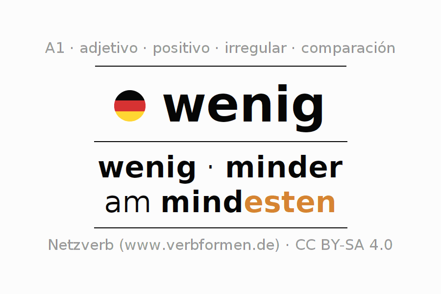 El comparativo en forma de tabla con todas sus formas de declinación: fuerte, débil y mixta. Estas están representadas de forma clara en una tabla sinópica en singular, plural y en los cuatro casos gramaticales: nominativo (primer caso), genitivo (segundo caso), dativo (tercer caso) y acusativo (cuarto caso). Aquí encontraras más información acerca del tema Wiktionary wenig y aquí también a través del Duden wenig.