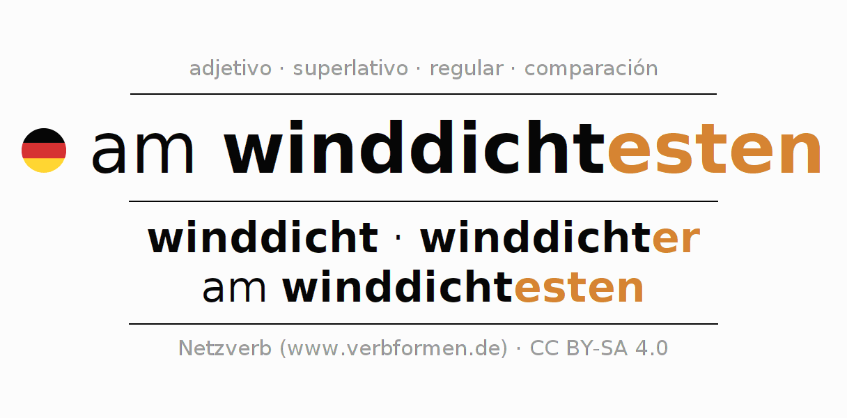 El comparativo en forma de tabla con todas sus formas de declinación: fuerte, débil y mixta. Estas están representadas de forma clara en una tabla sinópica en singular, plural y en los cuatro casos gramaticales: nominativo (primer caso), genitivo (segundo caso), dativo (tercer caso) y acusativo (cuarto caso). Aquí encontraras más información acerca del tema Wiktionary am winddichtesten y aquí también a través del Duden am winddichtesten.
