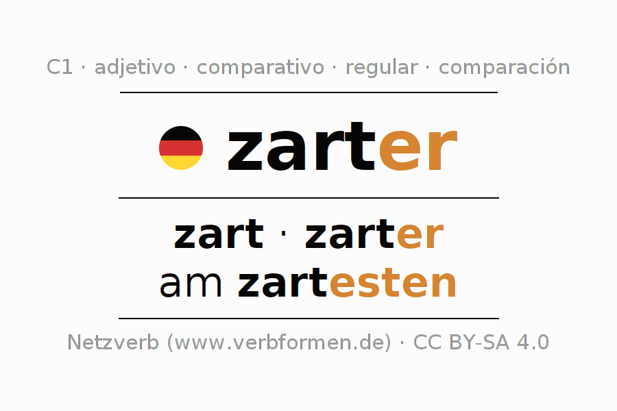 El comparativo en forma de tabla con todas sus formas de declinación: fuerte, débil y mixta. Estas están representadas de forma clara en una tabla sinópica en singular, plural y en los cuatro casos gramaticales: nominativo (primer caso), genitivo (segundo caso), dativo (tercer caso) y acusativo (cuarto caso). Aquí encontraras más información acerca del tema Wiktionary zarter y aquí también a través del Duden zarter.