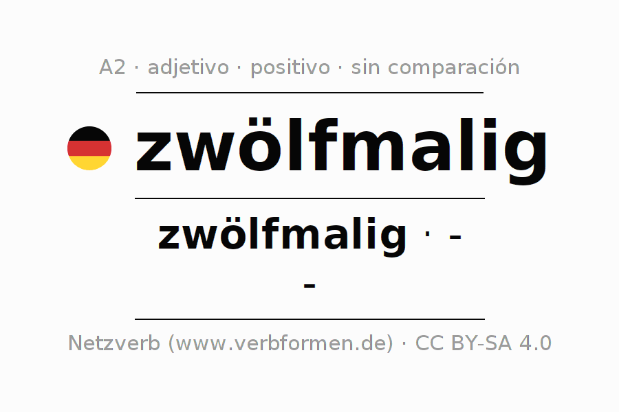 El adjetivo zwölfmalig se declina (doce veces) utilizando la construcción zwölfmalig, la cual no puede ser exaltada, es decir este adjetivo no permite formas del comparativo o superlativo. El adjetivo zwölfmalig puede ser utilizado de forma atributiva en frente de un sustantivo así como de forma predicativa en conjunto con un verbo.Aquí puedes declinar y comparar no solamente zwölfmalig sino también todos los adjetivos alemanes. Comentarios ☆