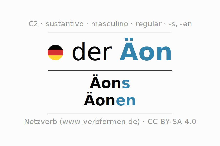 La declinación del sustantivo en forma de tabla con todas su formas: singular, plural y en los cuatro casos: nominativo (primer caso), genitivo (segundo caso), dativo (tercer caso) y acusativo (cuarto caso). Las construcciones gramaticales están representadas de forma clara en una tabla sinópica. La inflexión de los sustantivos es una ayuda durante tareas, exámenes, para cursos de alemán, la universidad, el estudio del alemán como lengua extranjera o como segundo idioma y para estudiantes adultos. La declinación correcta de las palabras es especialmente importante para los que aprenden el idioma alemán. Aquí encontraras más información acerca del tema Wiktionary Äon y aquí también a través del Duden Äon.