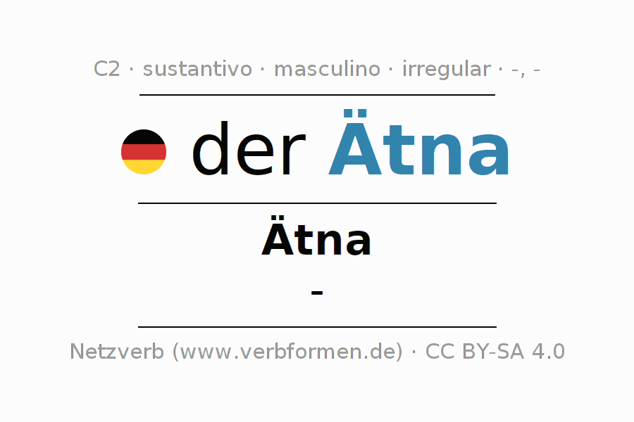 La declinación del sustantivoÄtna (Etna) se encuentra en genitivoÄtna del singular y en el nominativo- del plural. El sustantivo Ätna se declina con las terminaciones -/-. No permite construcciones en plural. El género gramatical de Ätna es masculino y por eso se requiere el artículo definido ‘der’. Aquí puedes declinar no solamente Ätna sino también todos los sustantivos alemanes . Este sustantivo pertenece al vocabulario necesario para pasar el examen "Zertifikat Deutsch" o para el nivel C2. Comentarios ☆