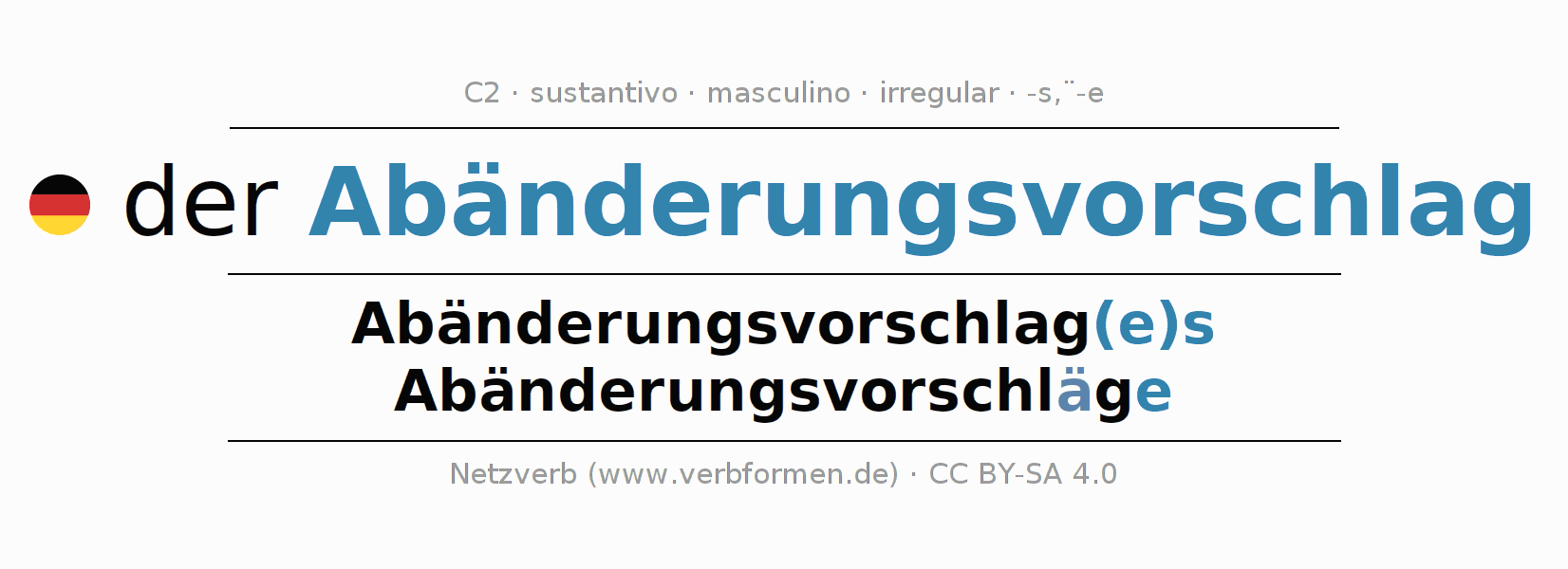 Resumen de todas las declinaciones del sustantivo Abänderungsvorschlag en todos los casos gramaticales.