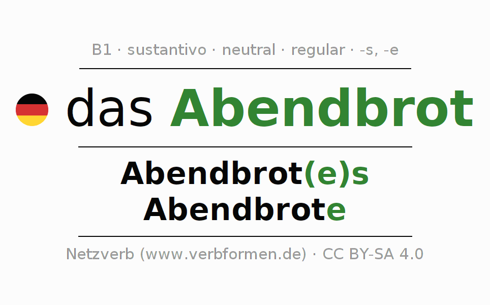 La declinación del sustantivo en forma de tabla con todas su formas: singular, plural y en los cuatro casos: nominativo (primer caso), genitivo (segundo caso), dativo (tercer caso) y acusativo (cuarto caso). Las construcciones gramaticales están representadas de forma clara en una tabla sinópica. La inflexión de los sustantivos es una ayuda durante tareas, exámenes, para cursos de alemán, la universidad, el estudio del alemán como lengua extranjera o como segundo idioma y para estudiantes adultos. La declinación correcta de las palabras es especialmente importante para los que aprenden el idioma alemán. Aquí encontraras más información acerca del tema Wiktionary Abendbrot y aquí también a través del Duden Abendbrot.