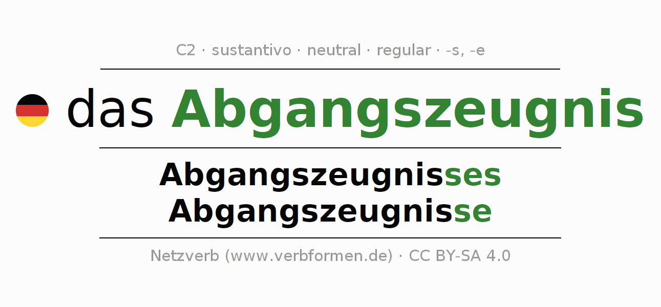 La declinación del sustantivo en forma de tabla con todas su formas: singular, plural y en los cuatro casos: nominativo (primer caso), genitivo (segundo caso), dativo (tercer caso) y acusativo (cuarto caso). Las construcciones gramaticales están representadas de forma clara en una tabla sinópica. La inflexión de los sustantivos es una ayuda durante tareas, exámenes, para cursos de alemán, la universidad, el estudio del alemán como lengua extranjera o como segundo idioma y para estudiantes adultos. La declinación correcta de las palabras es especialmente importante para los que aprenden el idioma alemán. Aquí encontraras más información acerca del tema Wiktionary Abgangszeugnis y aquí también a través del Duden Abgangszeugnis.