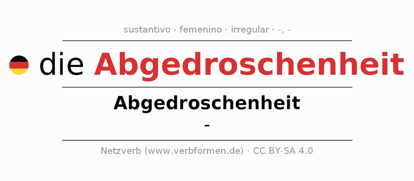 La declinación del sustantivo en forma de tabla con todas su formas: singular, plural y en los cuatro casos: nominativo (primer caso), genitivo (segundo caso), dativo (tercer caso) y acusativo (cuarto caso). Las construcciones gramaticales están representadas de forma clara en una tabla sinópica. La inflexión de los sustantivos es una ayuda durante tareas, exámenes, para cursos de alemán, la universidad, el estudio del alemán como lengua extranjera o como segundo idioma y para estudiantes adultos. La declinación correcta de las palabras es especialmente importante para los que aprenden el idioma alemán. Aquí encontraras más información acerca del tema Wiktionary Abgedroschenheit y aquí también a través del Duden Abgedroschenheit.