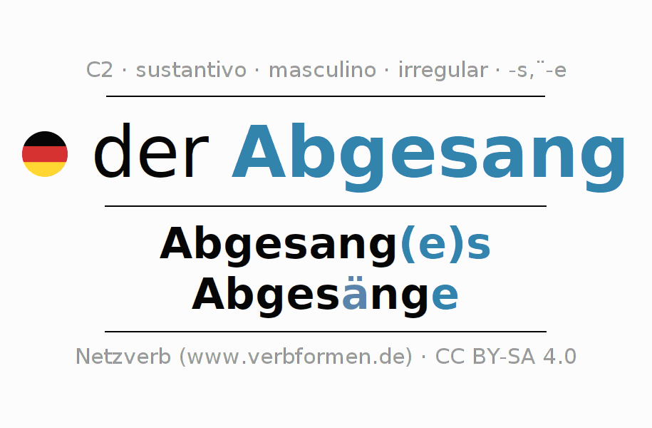 La declinación del sustantivo en forma de tabla con todas su formas: singular, plural y en los cuatro casos: nominativo (primer caso), genitivo (segundo caso), dativo (tercer caso) y acusativo (cuarto caso). Las construcciones gramaticales están representadas de forma clara en una tabla sinópica. La inflexión de los sustantivos es una ayuda durante tareas, exámenes, para cursos de alemán, la universidad, el estudio del alemán como lengua extranjera o como segundo idioma y para estudiantes adultos. La declinación correcta de las palabras es especialmente importante para los que aprenden el idioma alemán. Aquí encontraras más información acerca del tema Wiktionary Abgesang y aquí también a través del Duden Abgesang.