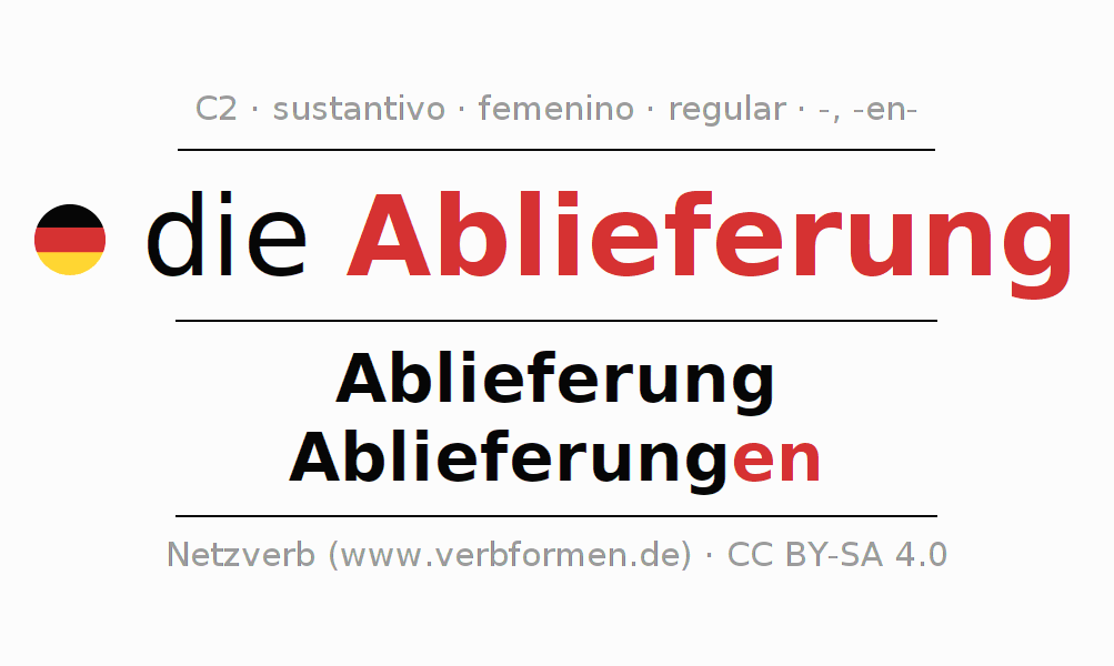 La declinación del sustantivo en forma de tabla con todas su formas: singular, plural y en los cuatro casos: nominativo (primer caso), genitivo (segundo caso), dativo (tercer caso) y acusativo (cuarto caso). Las construcciones gramaticales están representadas de forma clara en una tabla sinópica. La inflexión de los sustantivos es una ayuda durante tareas, exámenes, para cursos de alemán, la universidad, el estudio del alemán como lengua extranjera o como segundo idioma y para estudiantes adultos. La declinación correcta de las palabras es especialmente importante para los que aprenden el idioma alemán. Aquí encontraras más información acerca del tema Wiktionary Ablieferung y aquí también a través del Duden Ablieferung.