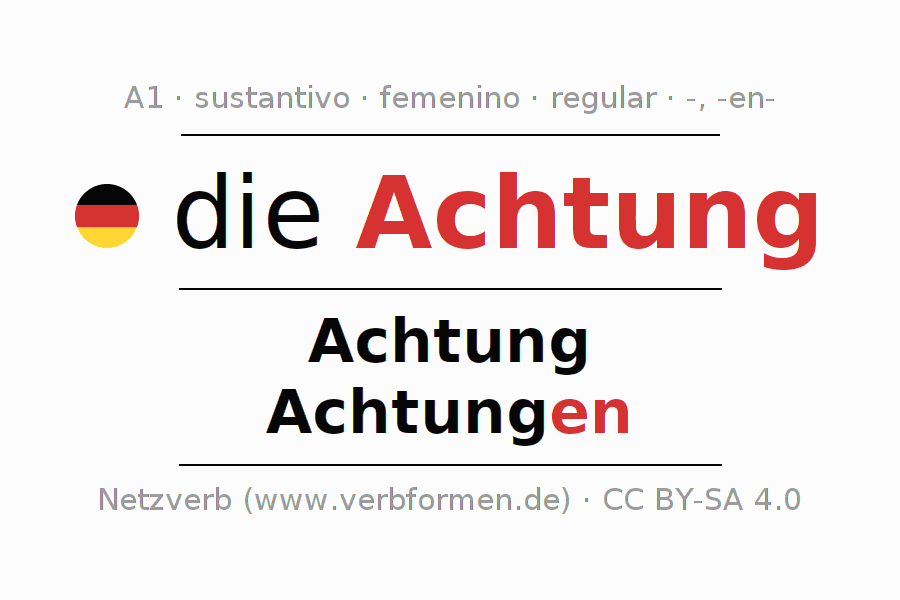 La declinación del sustantivoAchtung (atención, cuidado) se encuentra en genitivoAchtung del singular y en el nominativoAchtungen del plural. El sustantivo Achtung se declina de forma débil con las terminaciones -/en. El género gramatical de Achtung es femenino y por eso se requiere el artículo definido ‘die’. Aquí puedes declinar no solamente Achtung sino también todos los sustantivos alemanes . Este sustantivo pertenece al vocabulario necesario para pasar el examen "Zertifikat Deutsch" o para el nivel A1. Comentarios ☆
