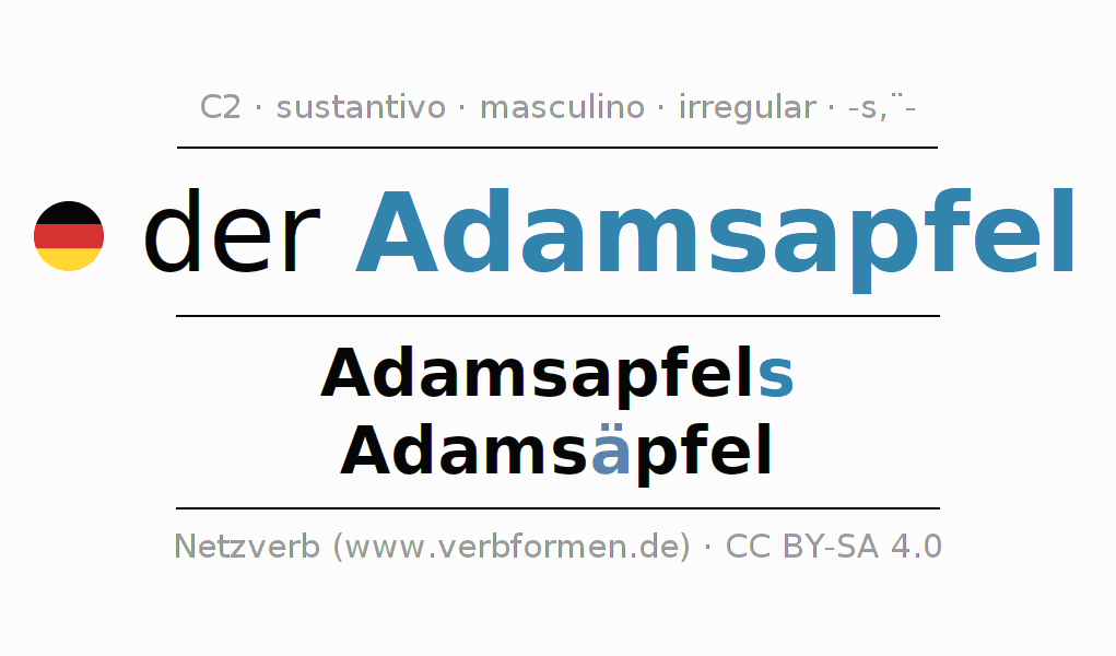 La declinación del sustantivo en forma de tabla con todas su formas: singular, plural y en los cuatro casos: nominativo (primer caso), genitivo (segundo caso), dativo (tercer caso) y acusativo (cuarto caso). Las construcciones gramaticales están representadas de forma clara en una tabla sinópica. La inflexión de los sustantivos es una ayuda durante tareas, exámenes, para cursos de alemán, la universidad, el estudio del alemán como lengua extranjera o como segundo idioma y para estudiantes adultos. La declinación correcta de las palabras es especialmente importante para los que aprenden el idioma alemán. Aquí encontraras más información acerca del tema Wiktionary Adamsapfel y aquí también a través del Duden Adamsapfel.
