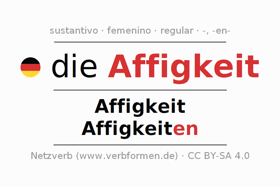La declinación del sustantivoAffigkeit se encuentra en genitivoAffigkeit del singular y en el nominativoAffigkeiten del plural. El sustantivo Affigkeit se declina de forma débil con las terminaciones -/en. El género gramatical de Affigkeit es femenino y por eso se requiere el artículo definido ‘die’. Aquí puedes declinar no solamente Affigkeit sino también todos los sustantivos alemanes . Comentarios ☆