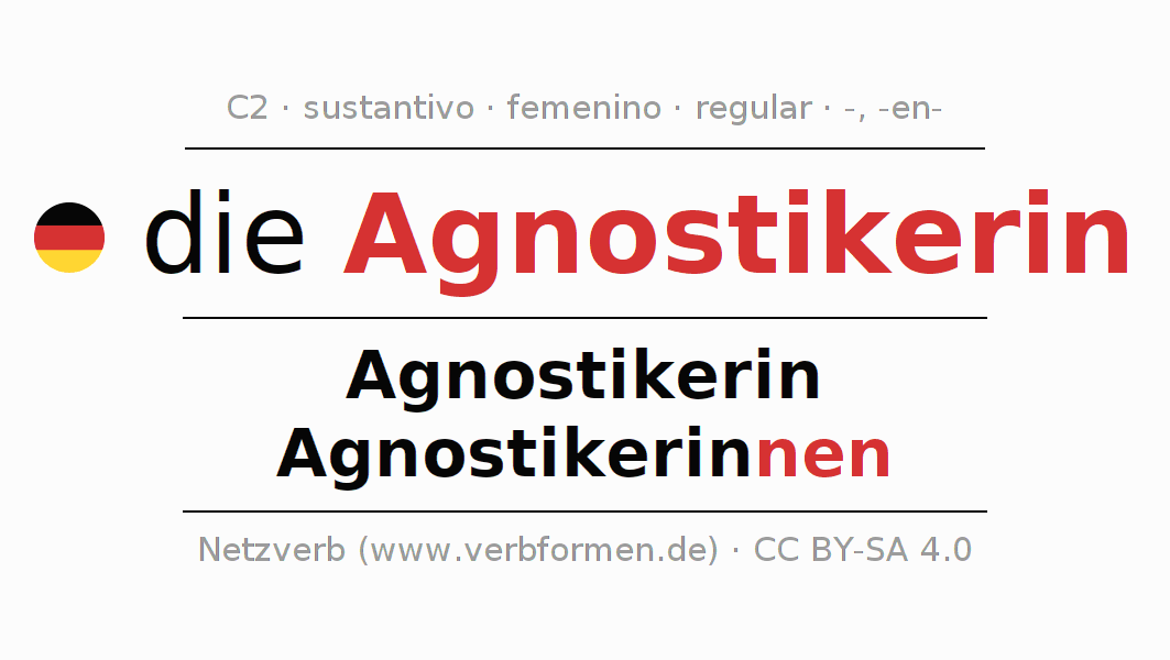La declinación del sustantivo en forma de tabla con todas su formas: singular, plural y en los cuatro casos: nominativo (primer caso), genitivo (segundo caso), dativo (tercer caso) y acusativo (cuarto caso). Las construcciones gramaticales están representadas de forma clara en una tabla sinópica. La inflexión de los sustantivos es una ayuda durante tareas, exámenes, para cursos de alemán, la universidad, el estudio del alemán como lengua extranjera o como segundo idioma y para estudiantes adultos. La declinación correcta de las palabras es especialmente importante para los que aprenden el idioma alemán. Aquí encontraras más información acerca del tema Wiktionary Agnostikerin y aquí también a través del Duden Agnostikerin.