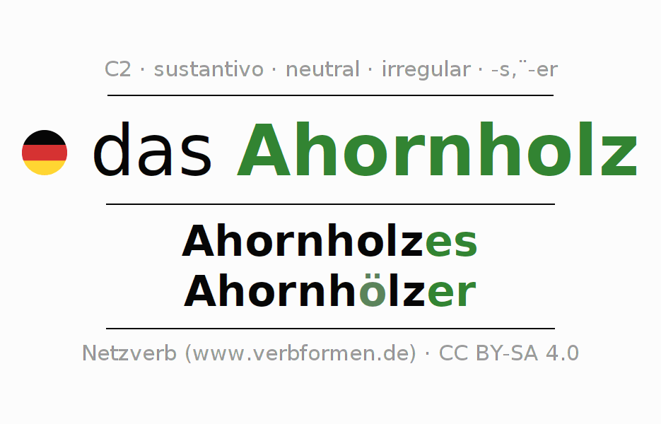 La declinación del sustantivo en forma de tabla con todas su formas: singular, plural y en los cuatro casos: nominativo (primer caso), genitivo (segundo caso), dativo (tercer caso) y acusativo (cuarto caso). Las construcciones gramaticales están representadas de forma clara en una tabla sinópica. La inflexión de los sustantivos es una ayuda durante tareas, exámenes, para cursos de alemán, la universidad, el estudio del alemán como lengua extranjera o como segundo idioma y para estudiantes adultos. La declinación correcta de las palabras es especialmente importante para los que aprenden el idioma alemán. Aquí encontraras más información acerca del tema Wiktionary Ahornholz y aquí también a través del Duden Ahornholz.
