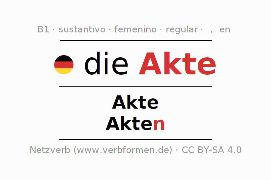 La declinación del sustantivoAkte (acta, expediente) se encuentra en genitivoAkte del singular y en el nominativoAkten del plural. El sustantivo Akte se declina de forma débil con las terminaciones -/n. El género gramatical de Akte es femenino y por eso se requiere el artículo definido ‘die’. Aquí puedes declinar no solamente Akte sino también todos los sustantivos alemanes . Este sustantivo pertenece al vocabulario necesario para pasar el examen "Zertifikat Deutsch" o para el nivel B1. Comentarios ☆