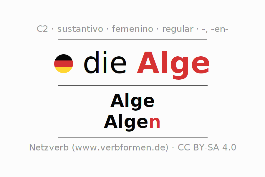 La declinación del sustantivoAlge (alga, algas) se encuentra en genitivoAlge del singular y en el nominativoAlgen del plural. El sustantivo Alge se declina de forma débil con las terminaciones -/n. El género gramatical de Alge es femenino y por eso se requiere el artículo definido ‘die’. Aquí puedes declinar no solamente Alge sino también todos los sustantivos alemanes . Este sustantivo pertenece al vocabulario necesario para pasar el examen "Zertifikat Deutsch" o para el nivel C2. Comentarios ☆