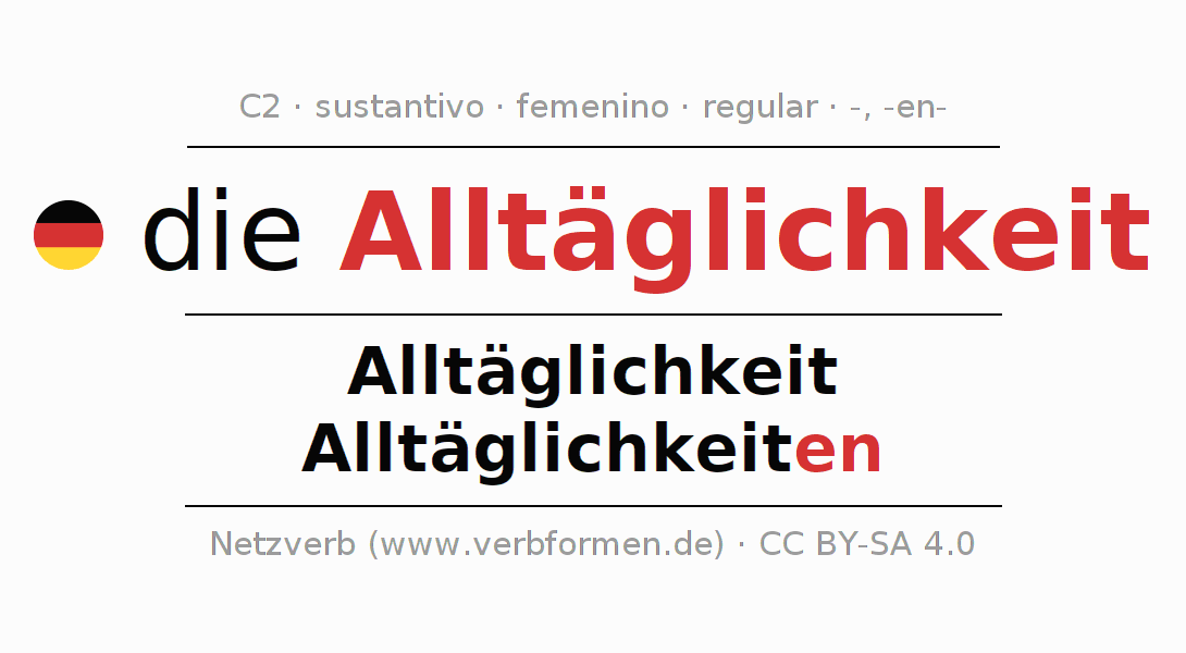 La declinación del sustantivo en forma de tabla con todas su formas: singular, plural y en los cuatro casos: nominativo (primer caso), genitivo (segundo caso), dativo (tercer caso) y acusativo (cuarto caso). Las construcciones gramaticales están representadas de forma clara en una tabla sinópica. La inflexión de los sustantivos es una ayuda durante tareas, exámenes, para cursos de alemán, la universidad, el estudio del alemán como lengua extranjera o como segundo idioma y para estudiantes adultos. La declinación correcta de las palabras es especialmente importante para los que aprenden el idioma alemán. Aquí encontraras más información acerca del tema Wiktionary Alltäglichkeit y aquí también a través del Duden Alltäglichkeit.
