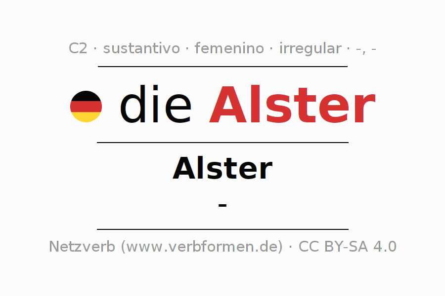 La declinación del sustantivoAlster (afluente derecho de la Unterelbe, graja) se encuentra en genitivoAlster del singular y en el nominativo- del plural. El sustantivo Alster se declina con las terminaciones -/-. No permite construcciones en plural. El género gramatical de Alster es femenino y por eso se requiere el artículo definido ‘die’. Aquí puedes declinar no solamente Alster sino también todos los sustantivos alemanes . Este sustantivo pertenece al vocabulario necesario para pasar el examen "Zertifikat Deutsch" o para el nivel C2. Comentarios ☆
