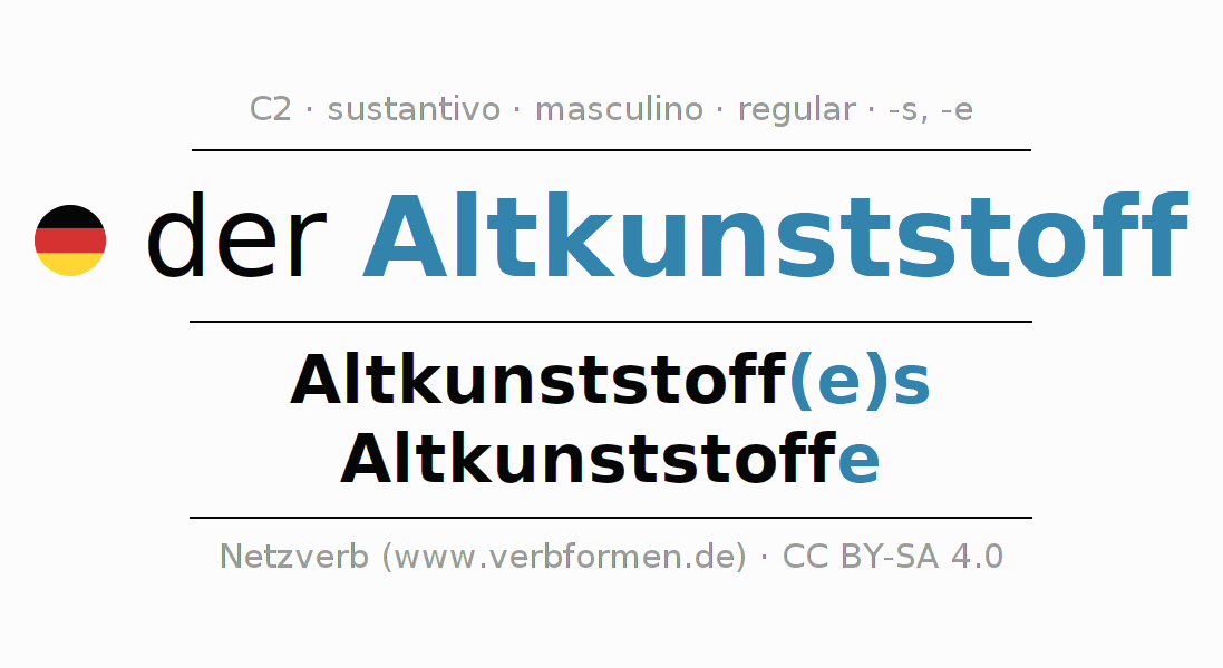 La declinación del sustantivoAltkunststoff (plásticos reciclados) se encuentra en genitivoAltkunststoff(e)s del singular y en el nominativoAltkunststoffe del plural. El sustantivo Altkunststoff se conjuga de forma fuerte (irregular) con estas terminaciones es/e. El género gramatical de Altkunststoff es masculino y por eso se requiere el artículo definido ‘der’. Aquí puedes declinar no solamente Altkunststoff sino también todos los sustantivos alemanes . Este sustantivo pertenece al vocabulario necesario para pasar el examen "Zertifikat Deutsch" o para el nivel C2. Comentarios ☆