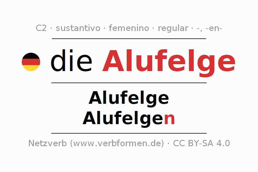 La declinación del sustantivo en forma de tabla con todas su formas: singular, plural y en los cuatro casos: nominativo (primer caso), genitivo (segundo caso), dativo (tercer caso) y acusativo (cuarto caso). Las construcciones gramaticales están representadas de forma clara en una tabla sinópica. La inflexión de los sustantivos es una ayuda durante tareas, exámenes, para cursos de alemán, la universidad, el estudio del alemán como lengua extranjera o como segundo idioma y para estudiantes adultos. La declinación correcta de las palabras es especialmente importante para los que aprenden el idioma alemán. Aquí encontraras más información acerca del tema Wiktionary Alufelge y aquí también a través del Duden Alufelge.