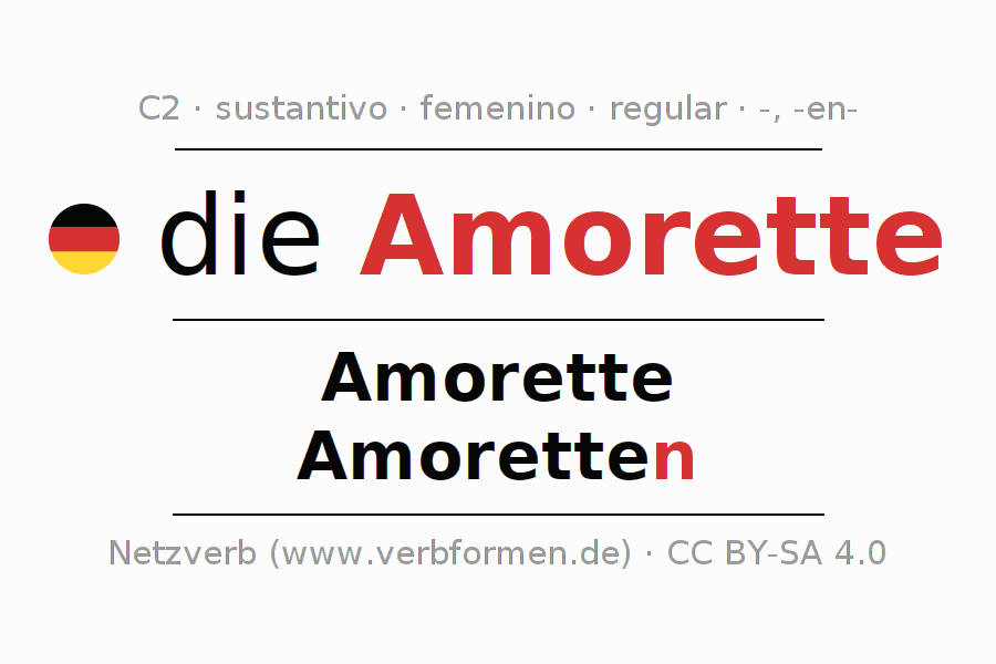 La declinación del sustantivo en forma de tabla con todas su formas: singular, plural y en los cuatro casos: nominativo (primer caso), genitivo (segundo caso), dativo (tercer caso) y acusativo (cuarto caso). Las construcciones gramaticales están representadas de forma clara en una tabla sinópica. La inflexión de los sustantivos es una ayuda durante tareas, exámenes, para cursos de alemán, la universidad, el estudio del alemán como lengua extranjera o como segundo idioma y para estudiantes adultos. La declinación correcta de las palabras es especialmente importante para los que aprenden el idioma alemán. Aquí encontraras más información acerca del tema Wiktionary Amorette y aquí también a través del Duden Amorette.