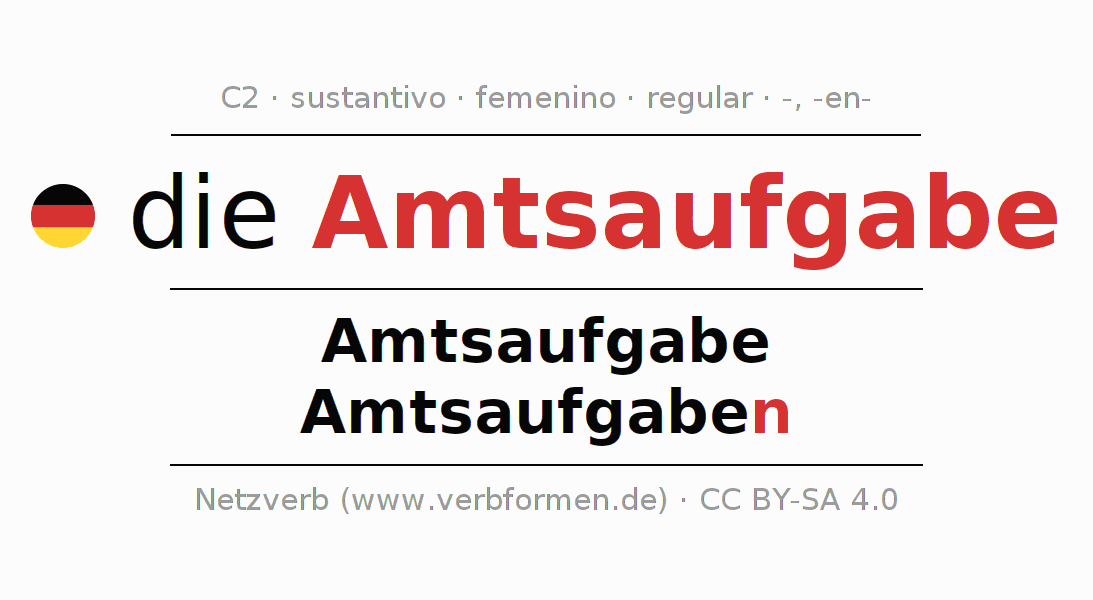 La declinación del sustantivo en forma de tabla con todas su formas: singular, plural y en los cuatro casos: nominativo (primer caso), genitivo (segundo caso), dativo (tercer caso) y acusativo (cuarto caso). Las construcciones gramaticales están representadas de forma clara en una tabla sinópica. La inflexión de los sustantivos es una ayuda durante tareas, exámenes, para cursos de alemán, la universidad, el estudio del alemán como lengua extranjera o como segundo idioma y para estudiantes adultos. La declinación correcta de las palabras es especialmente importante para los que aprenden el idioma alemán. Aquí encontraras más información acerca del tema Wiktionary Amtsaufgabe y aquí también a través del Duden Amtsaufgabe.