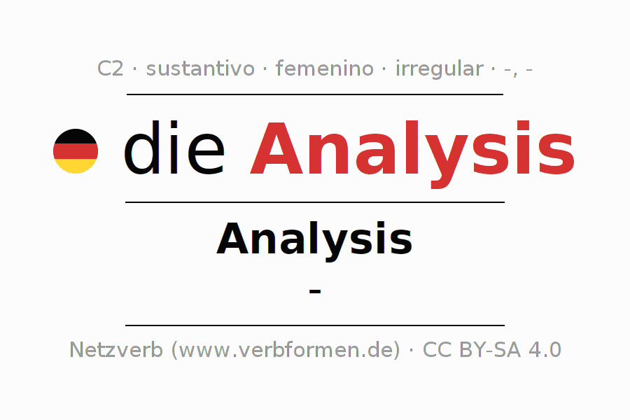 La declinación del sustantivoAnalysis (análisis, análisis matemático) se encuentra en genitivoAnalysis del singular y en el nominativo- del plural. El sustantivo Analysis se declina con las terminaciones -/-. No permite construcciones en plural. El género gramatical de Analysis es femenino y por eso se requiere el artículo definido ‘die’. Aquí puedes declinar no solamente Analysis sino también todos los sustantivos alemanes . Este sustantivo pertenece al vocabulario necesario para pasar el examen "Zertifikat Deutsch" o para el nivel C2. Comentarios ☆