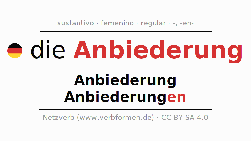 La declinación del sustantivo en forma de tabla con todas su formas: singular, plural y en los cuatro casos: nominativo (primer caso), genitivo (segundo caso), dativo (tercer caso) y acusativo (cuarto caso). Las construcciones gramaticales están representadas de forma clara en una tabla sinópica. La inflexión de los sustantivos es una ayuda durante tareas, exámenes, para cursos de alemán, la universidad, el estudio del alemán como lengua extranjera o como segundo idioma y para estudiantes adultos. La declinación correcta de las palabras es especialmente importante para los que aprenden el idioma alemán. Aquí encontraras más información acerca del tema Wiktionary Anbiederung y aquí también a través del Duden Anbiederung.