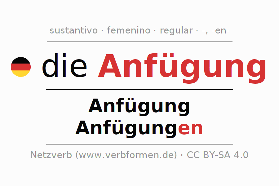 La declinación del sustantivo en forma de tabla con todas su formas: singular, plural y en los cuatro casos: nominativo (primer caso), genitivo (segundo caso), dativo (tercer caso) y acusativo (cuarto caso). Las construcciones gramaticales están representadas de forma clara en una tabla sinópica. La inflexión de los sustantivos es una ayuda durante tareas, exámenes, para cursos de alemán, la universidad, el estudio del alemán como lengua extranjera o como segundo idioma y para estudiantes adultos. La declinación correcta de las palabras es especialmente importante para los que aprenden el idioma alemán. Aquí encontraras más información acerca del tema Wiktionary Anfügung y aquí también a través del Duden Anfügung.