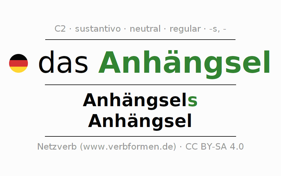 La declinación del sustantivo en forma de tabla con todas su formas: singular, plural y en los cuatro casos: nominativo (primer caso), genitivo (segundo caso), dativo (tercer caso) y acusativo (cuarto caso). Las construcciones gramaticales están representadas de forma clara en una tabla sinópica. La inflexión de los sustantivos es una ayuda durante tareas, exámenes, para cursos de alemán, la universidad, el estudio del alemán como lengua extranjera o como segundo idioma y para estudiantes adultos. La declinación correcta de las palabras es especialmente importante para los que aprenden el idioma alemán. Aquí encontraras más información acerca del tema Wiktionary Anhängsel y aquí también a través del Duden Anhängsel.