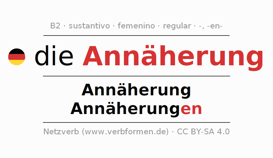 La declinación del sustantivo en forma de tabla con todas su formas: singular, plural y en los cuatro casos: nominativo (primer caso), genitivo (segundo caso), dativo (tercer caso) y acusativo (cuarto caso). Las construcciones gramaticales están representadas de forma clara en una tabla sinópica. La inflexión de los sustantivos es una ayuda durante tareas, exámenes, para cursos de alemán, la universidad, el estudio del alemán como lengua extranjera o como segundo idioma y para estudiantes adultos. La declinación correcta de las palabras es especialmente importante para los que aprenden el idioma alemán. Aquí encontraras más información acerca del tema Wiktionary Annäherung y aquí también a través del Duden Annäherung.